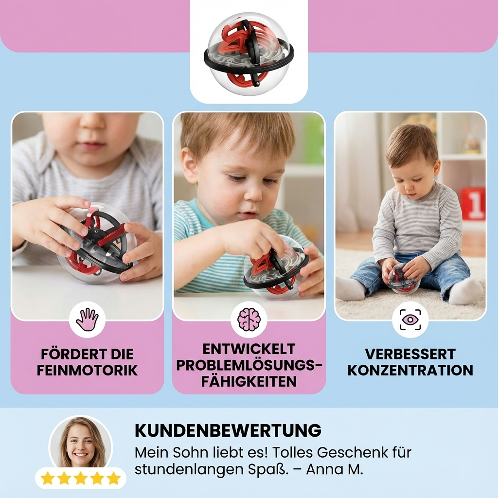 "Das 3D Labyrinth Puzzle Kugel ist eine großartige Herausforderung, die sowohl Spaß macht als auch die Konzentration fördert. Es hilft mir, meine Geduld und Problemlösungsfähigkeiten zu verbessern, was ich im Alltag sehr zu schätzen weiß."