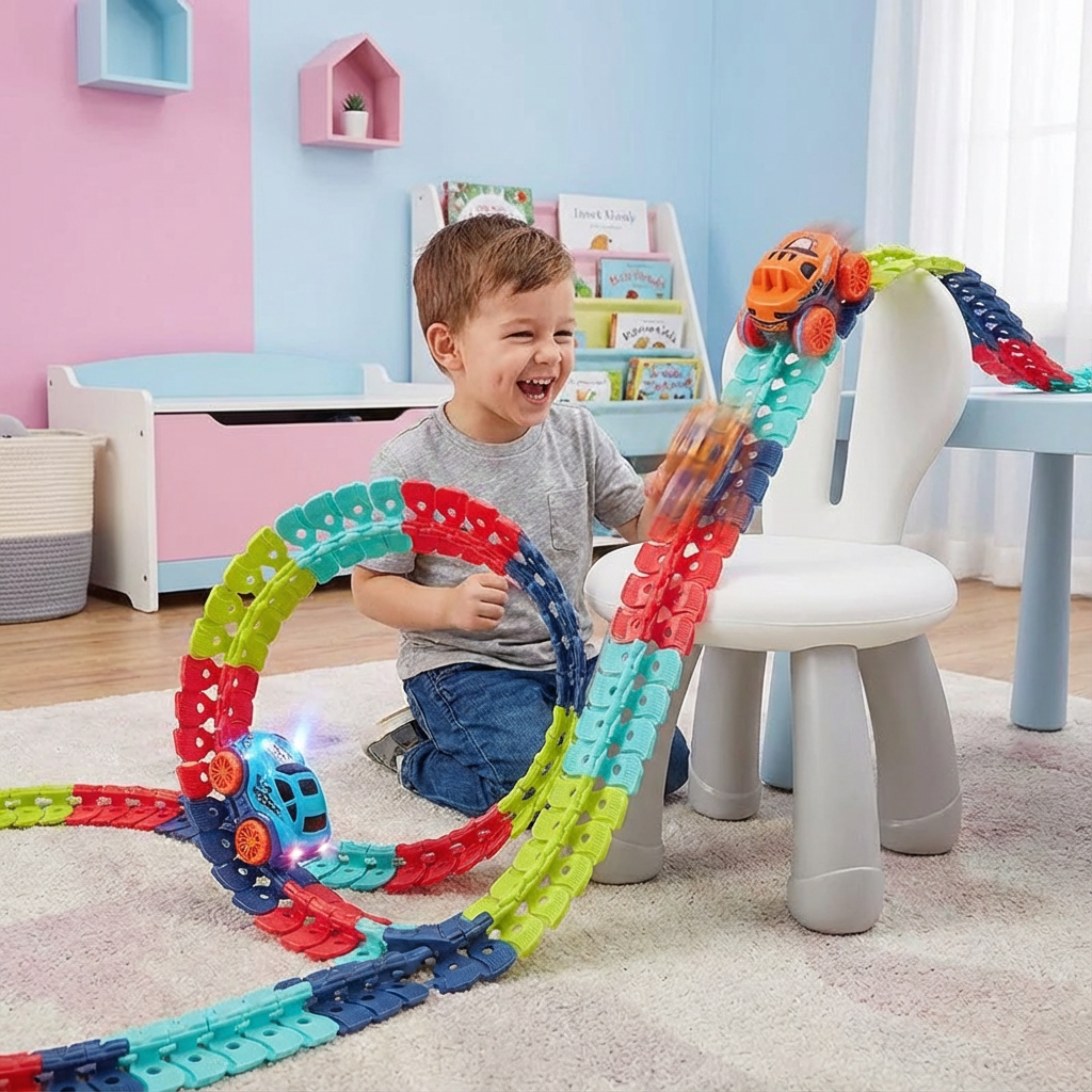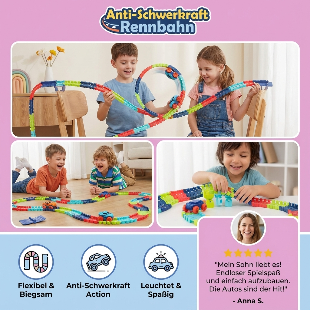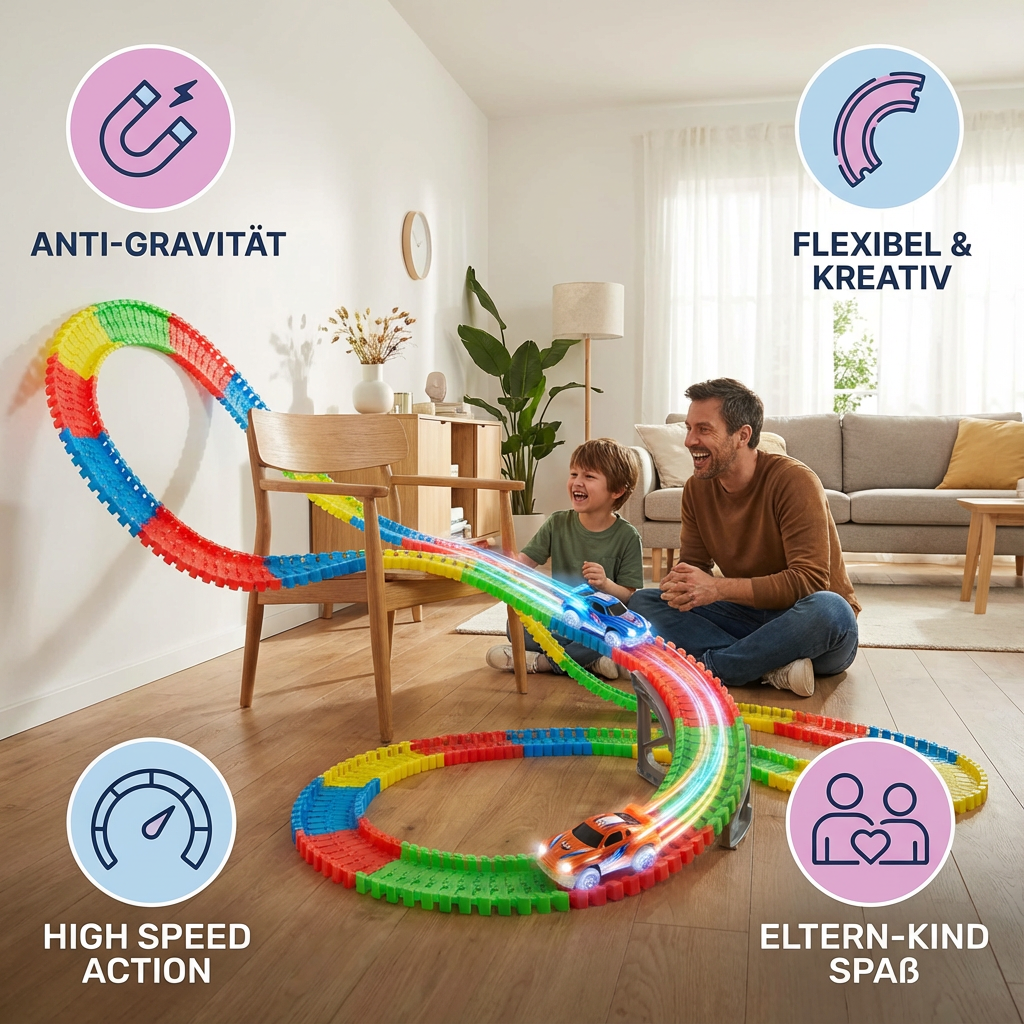 Die Anti-Schwerkraft Rennbahn wurde speziell entwickelt, um den Spielspaß Deiner Kinder zu maximieren. Das innovative Design ermöglicht es, spektakuläre Loopings und Schwerkraft-Tricks zu erleben, die jede Rennsession unvergesslich machen. Die flexiblen Schienen lassen sich in verschiedene Formen biegen, sodass Du und Deine Kinder immer wieder neue, spannende Strecken bauen könnt.