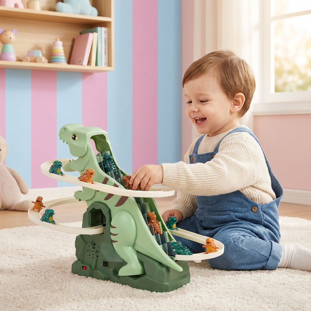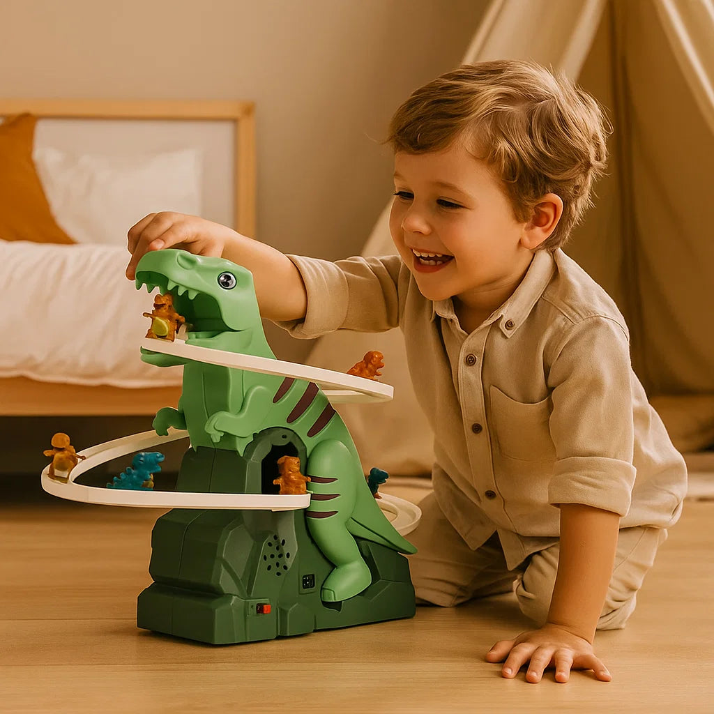 Mit der Dino Rutsche Achterbahn verwandelt sich jedes Kinderzimmer oder der Garten in einen aufregenden Erlebnispark. Kinder lieben es, mit Schwung die Bahn hinunterzurutschen und dabei immer wieder neue Abenteuer zu erleben. Das farbenfrohe Dino-Design begeistert die Kleinen sofort und fördert spielerisch Bewegung, Freude und Fantasie.
