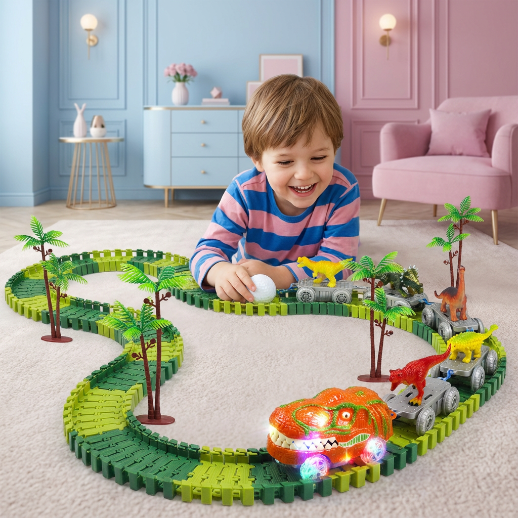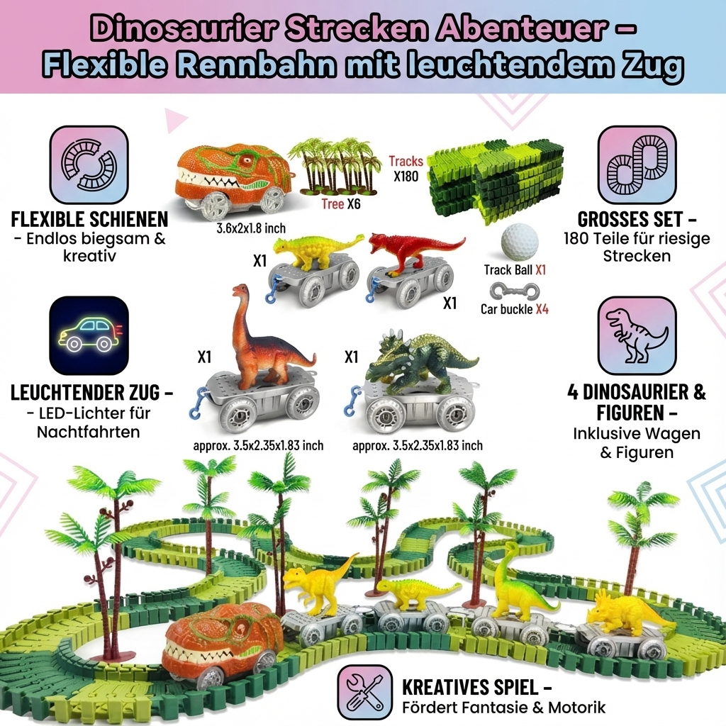 Mit dem Dinosaurier Strecken Abenteuer – Flexible Rennbahn mit leuchtendem Zug beginnt eine aufregende Reise in die Welt der Urzeit! Kinder können ihre eigene Rennstrecke gestalten, Kurven formen, Brücken bauen und den leuchtenden Zug durch eine Welt voller Dinosaurier steuern. Das Set vereint kreatives Bauen, Bewegung und leuchtende Effekte zu einem faszinierenden Spielerlebnis, das Fantasie und Abenteuerlust gleichermaßen anregt.