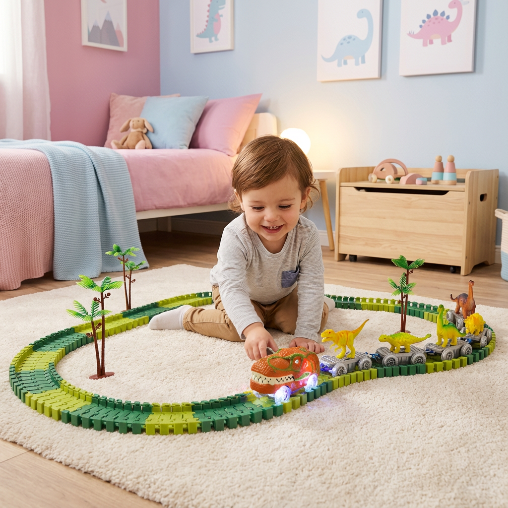 "Mein Sohn ist total begeistert vom Dinosaurier Strecken Abenteuer – er baut ständig neue Strecken und kann gar nicht genug von den leuchtenden Zügen bekommen. Besonders praktisch finde ich, dass die Schienen so flexibel sind und sich leicht zusammenstecken lassen, selbst für kleine Kinderhände."