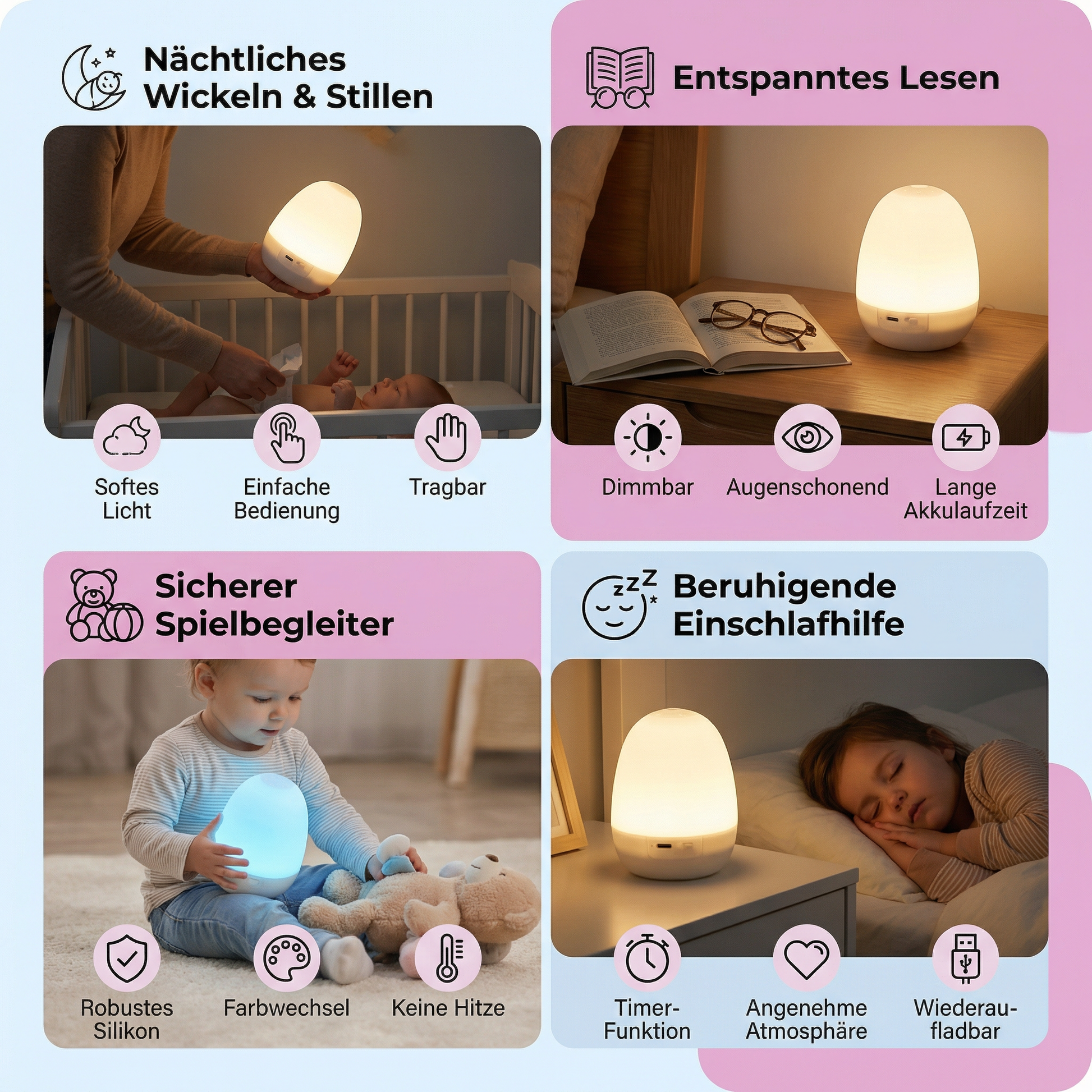 Ob zum Einschlafen, Stillen, Lesen oder als sanfte Hintergrundbeleuchtung – dieses Nachtlicht sorgt jederzeit für eine ruhige, harmonische Atmosphäre.