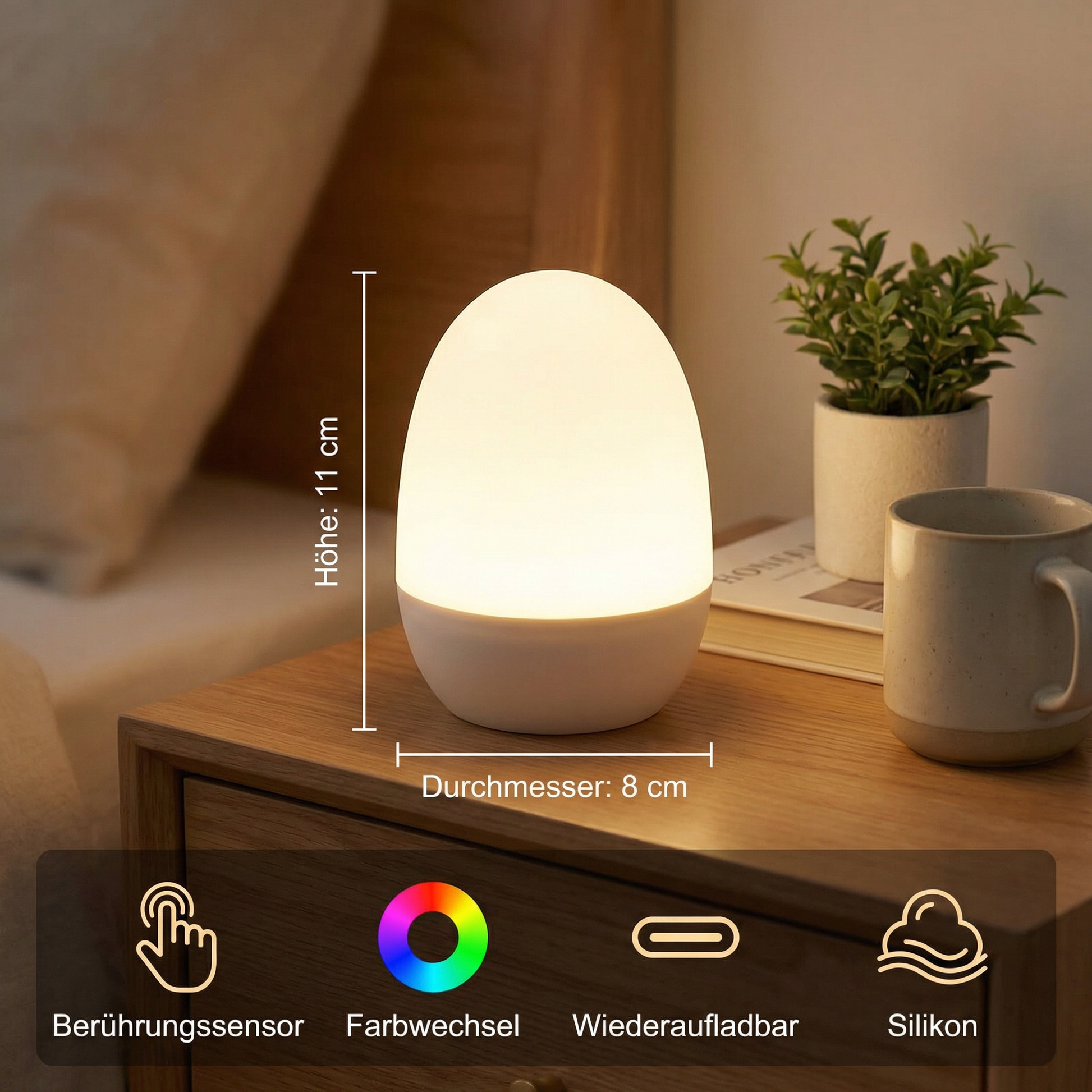 Dieses ei-förmige LED-Nachtlicht aus hochwertigem, weichem Silikon kombiniert zeitloses Design mit durchdachter Funktionalität. Es spendet ein angenehm gleichmäßiges, blendfreies Licht und eignet sich ideal als Nachtlicht, Orientierungslicht oder stimmungsvolle Beleuchtung für entspannte Abendstunden.