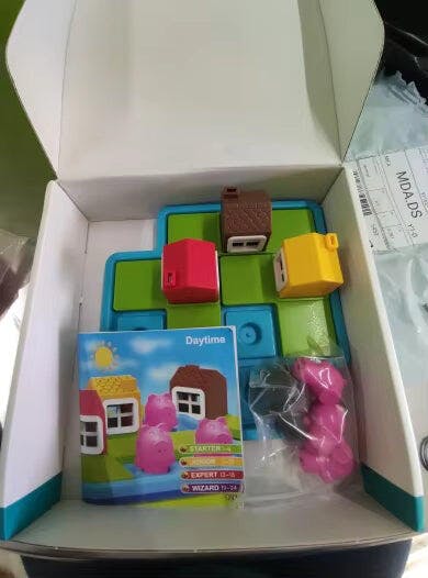 "Unsere Kinder lieben das Spiel, weil sie die Geschichte der drei Schweinchen nachbauen und dabei ihrer Fantasie freien Lauf lassen können. Besonders gefällt mir, dass ganz nebenbei Konzentration und Feinmotorik gefördert werden."