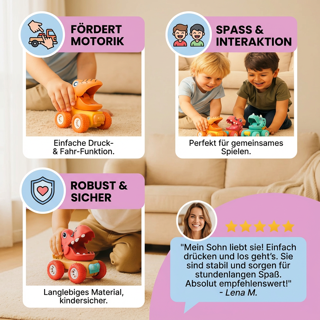 "Mein Sohn liebt die PUSH & DRIVE DINO MONSTERTRUCKS – sie fahren super schnell und sind dank des einfachen Systems perfekt für kleine Hände. Besonders praktisch ist, dass sie so robust sind und auch problemlos auf unseren unebenen Böden fahren."