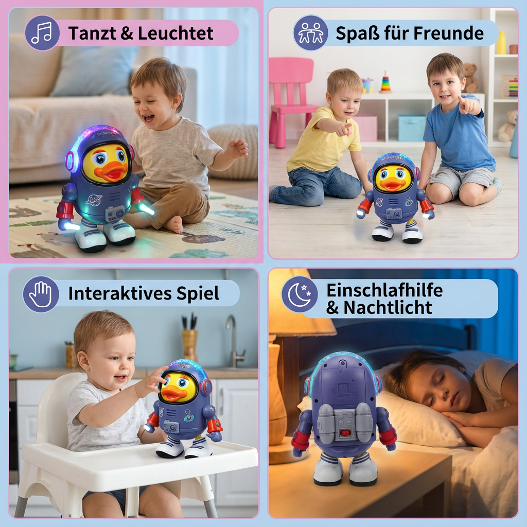 Mit ihren aufregenden Tanzbewegungen und den fröhlichen Melodien sorgt die Tanzende Astronaut Ente für viele glückliche Momente. Sie hilft dabei, die Fantasie zu beflügeln und lässt Kinder in die Rolle eines kleinen Raumfahrers schlüpfen, während sie die Ente beobachten, wie sie ihren „Weltall-Tanz“ aufführt.