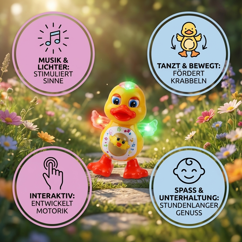 Die tanzende Baby Ente sorgt mit fröhlicher Musik, bunten Lichtern und lustigen Bewegungen für strahlende Kinderaugen. Sie fördert nicht nur die motorische Entwicklung, sondern regt auch die Fantasie an und lädt zum Mitmachen, Lachen und Staunen ein.
